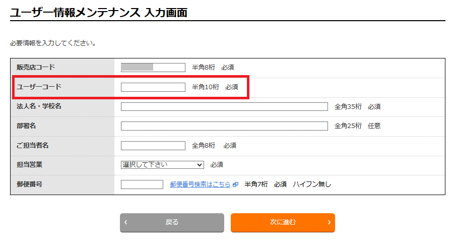 ※翌日以降、代表アカウントのユーザー登録が完了しましたら、同じ画面から、各支店のユーザー登録を行ってください。その際、代表法人コード欄は、1日目に設定した、代表となるアカウントのユーザーコードを指定してください。デフォルトは、登録する支店のユーザーコードが入っていますが、「代表となるアカウントのユーザーコード」に変更してください。
